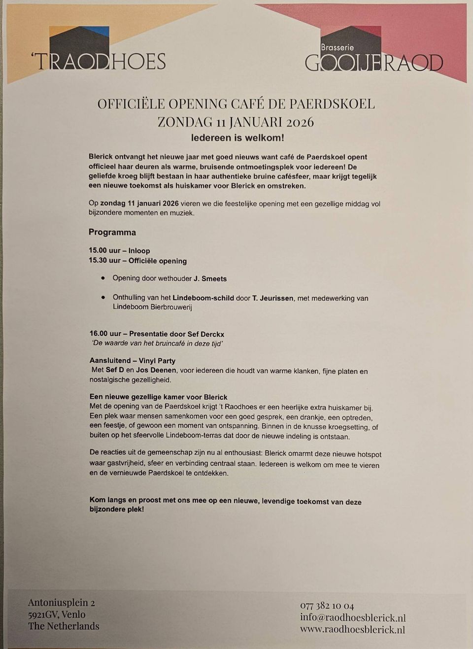 UITNODIGING!! Officiële opening De Paerdskoel op zondag 11 januari 2026 IEDEREEN IS WELKOM! Zondag 11 januari vieren we de feestelijke opening met een gezellig middag vol bijzondere momenten en muziek. Programma