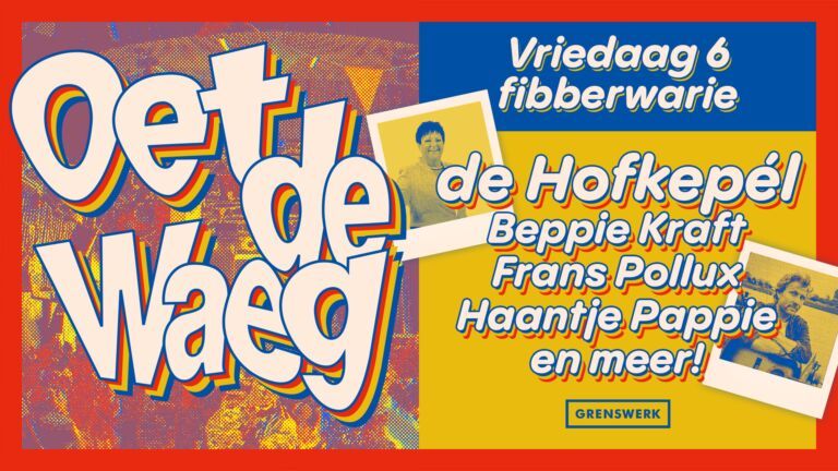 Poppodium Grenswerk lanceert Oet De Waeg: een nieuwe vastelaovesavond in Venlo. Op vrijdag 6 februari 2026 staat Jocus Hofkepèl op het podium met klassiekers, meezingers en gasten als Beppie Kraft en Frans Pollux. Kaartverkoop start zaterdag 29 november om 11:11.