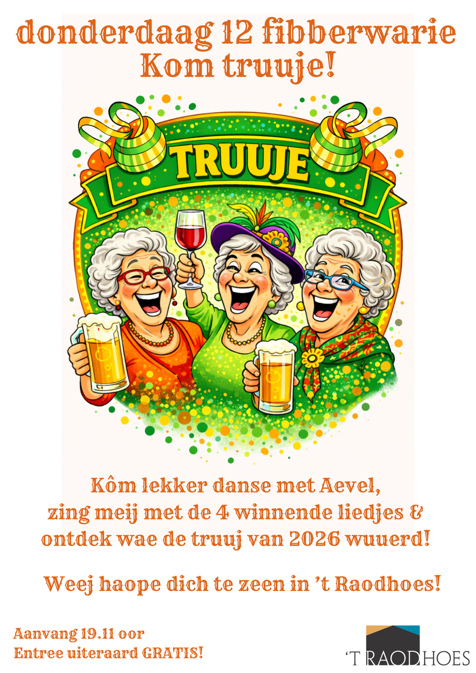 KOM TRUUJE IN ‘T RAODHOES. SAAME MET DIALEKBAND AEVEL GAON WEEJ D’R EIN ENORM FEESJE VAN MAAKE!! 12 fibberwarie geit t daak d’raaf. Saame met Aevel, os hoes DJ’s, de winnende liedjes en ut oetroope van de Truuj door Wort...