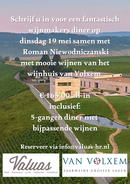 Op dinsdag 19 mei organiseert Valuas een wijnmakers diner in samenwerking met Roman Nie...